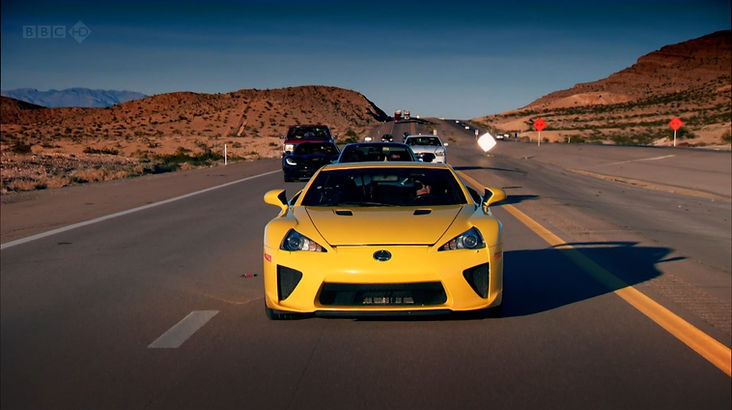The trio set off on a road trip through Nevada and California, each convinced they have chosen the ultimate supercar. Clarkson backs the Lexus LFA, May champions the new Aston Martin Vanquish, and Hammond argues the case for the SRT Viper. Beginning in the Valley of Fire, they travel through Las Vegas and head to the Las Vegas Motor Speedway for police-run drag races, visit the Civic Musical Road, and take part in an aerial game of Laser Quest at Willow Springs International Motorsports Park. The journey continues to Los Angeles, where their antics at the Sepulveda Dam land them in trouble, before concluding with a race from Palm Springs to Calexico on the Mexican border. The last presenter to arrive must cross into Mexico and review the country’s first supercar in a future episode. Meanwhile, Fleetwood Mac drummer Mick Fleetwood is the latest star to tackle the track in the Kia.